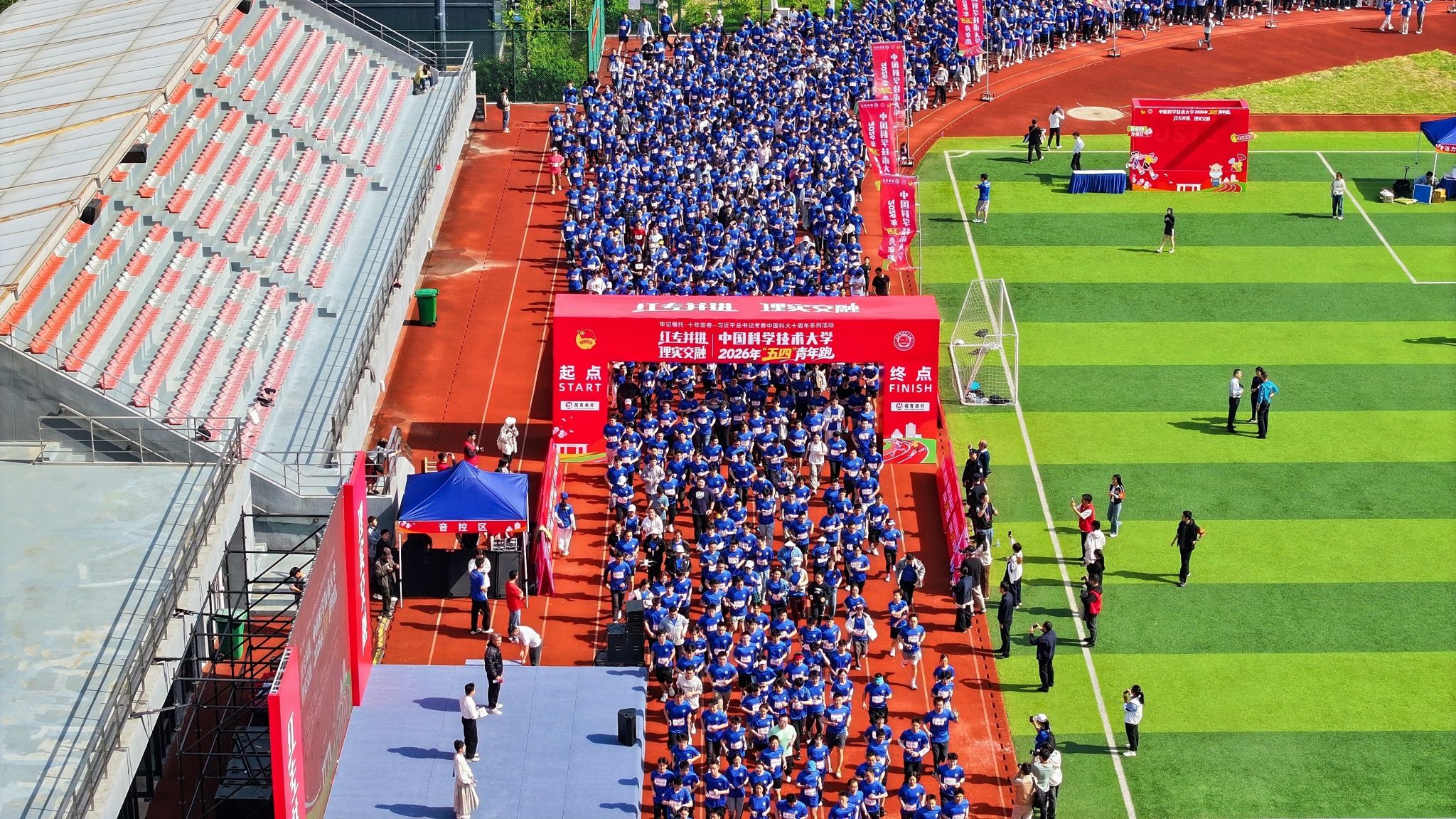 千坤在西区致辞中回顾了五四先驱的呐喊与习对中国科大学子争做“六有”大学生的殷切期望。活动负责人瞿梓俊就赛事安全注意事项作出说明,详细介绍了医疗点、急救车、AED设备部署及数十名医疗跑者全程护航等保障措施,提醒跑者科学参与、有序奔跑。开跑前,西区热身教练窦盛凯老师、高新校区热身教练王林老师带领全体参赛者进行充分热身。